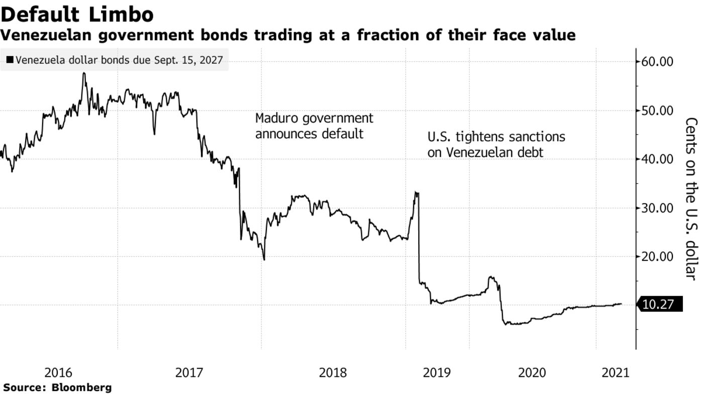 After defaulting in late 2017, Venezuela’s debt trades at about 10 cents on the dollar. Recently, a group of creditors holding the 2025 bonds demanded full payment of overdue interest and principal in a process known as acceleration.