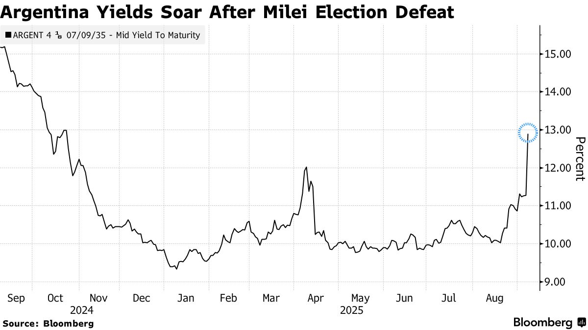 - Argentina’s currency, bonds and stocks plunged after President Javier Milei’s party suffered a landslide defeat in a key provincial election.