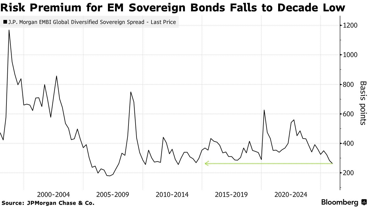 - The spread for emerging-market governments bonds over Treasuries has fallen to a decade low, creating an opportunity for troubled nations to regain market access.